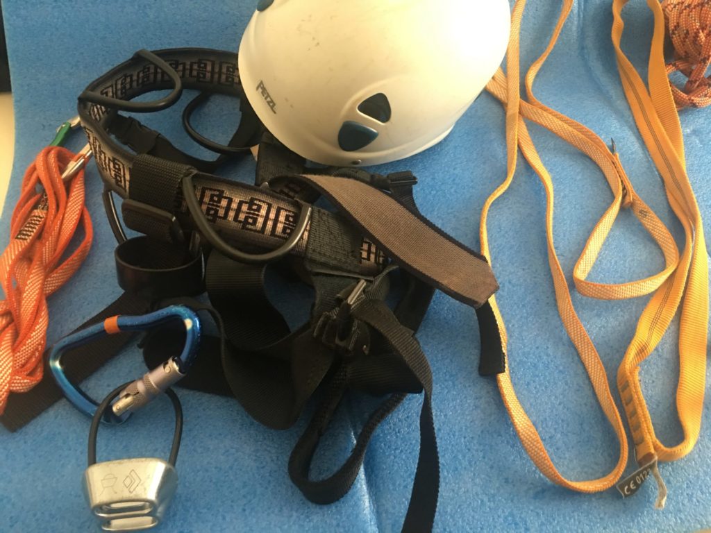 ・ハーネス=クライミング兼用で可。専用に使うならパッドなしがよい。