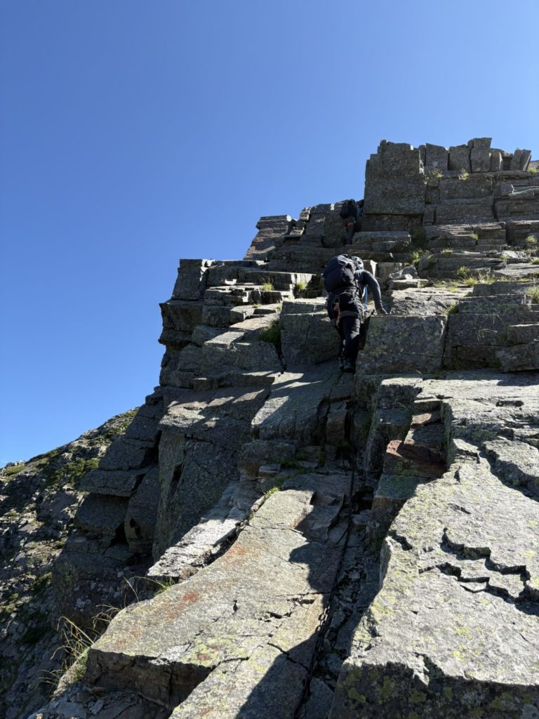 西穂ピーク(2909m)でハーネスを装着した。使わないかもしれないが、何かの時の対応に格段の差となるだろう。もちろん、そんなことは望みもしない。紺碧の空はどこまでも広がり、カラビナに反射する光が眩しい。仲間の笑い声が岩壁に反響し、谷へ吸い込まれていく。頂から一歩踏み出すと、ザレた急降下が待ち受けている。そこはもう引き返せない世界。緊張も喜びも、同じ強さで胸に押し寄せる。この感覚は、人生で新たな一歩を踏み出す瞬間そのものだ。安全な場所から離れ、不確かな道へと進むとき、人は初めて「生きている」実感を得る。