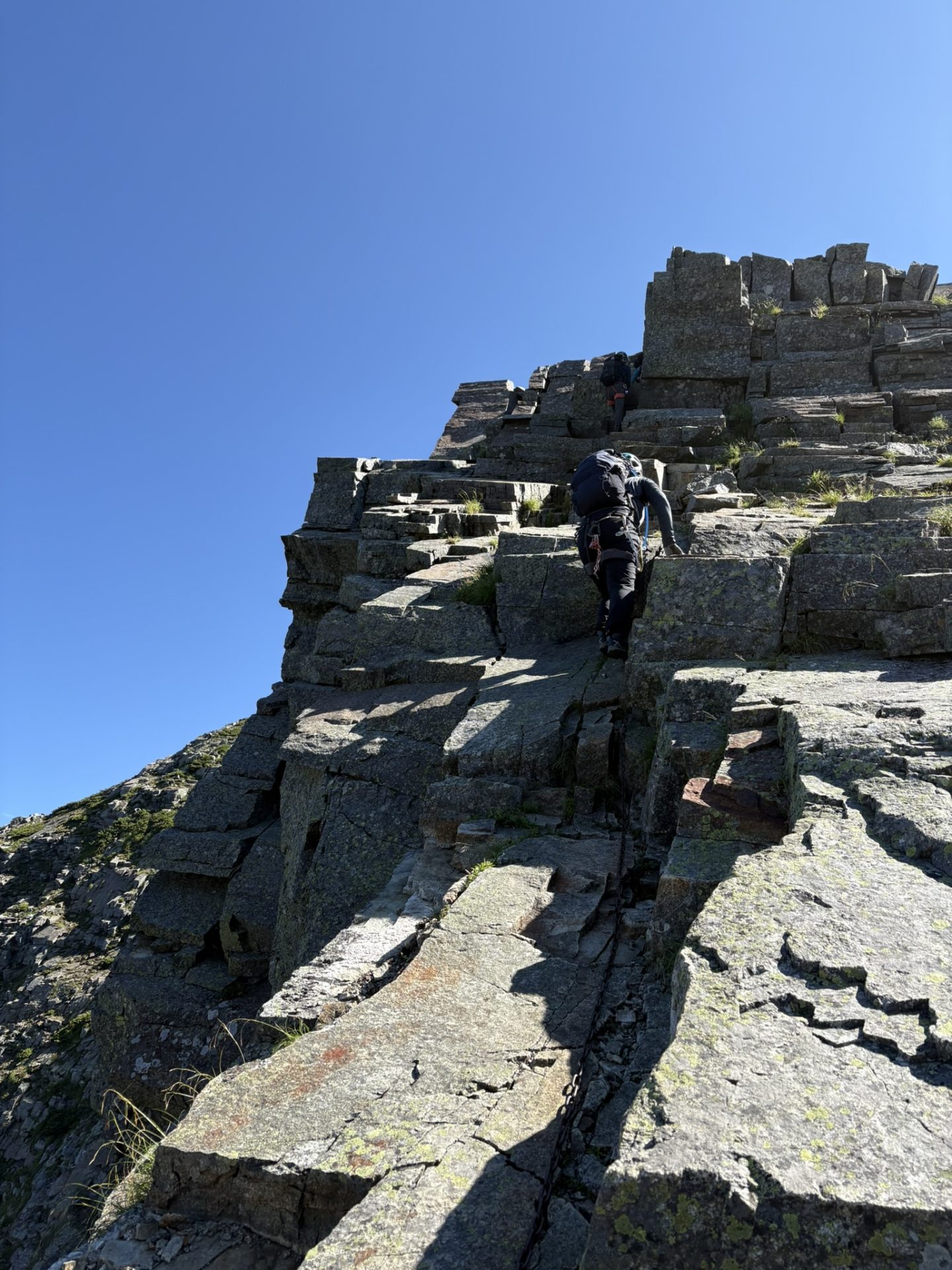 鎖を頼りに陽光が眩しく反射する逆層スラブを乗り越え、天狗ノ頭を目指す。石が折り重なったようなルートの、どこを行こうが自由だ。しかし、少しのずれで難易度が大きく違ってくる。ルーファイの力が試される。だが、きょうのメンバーを見れば多少難易度が上がっても対応力には余裕があると踏んでいる。