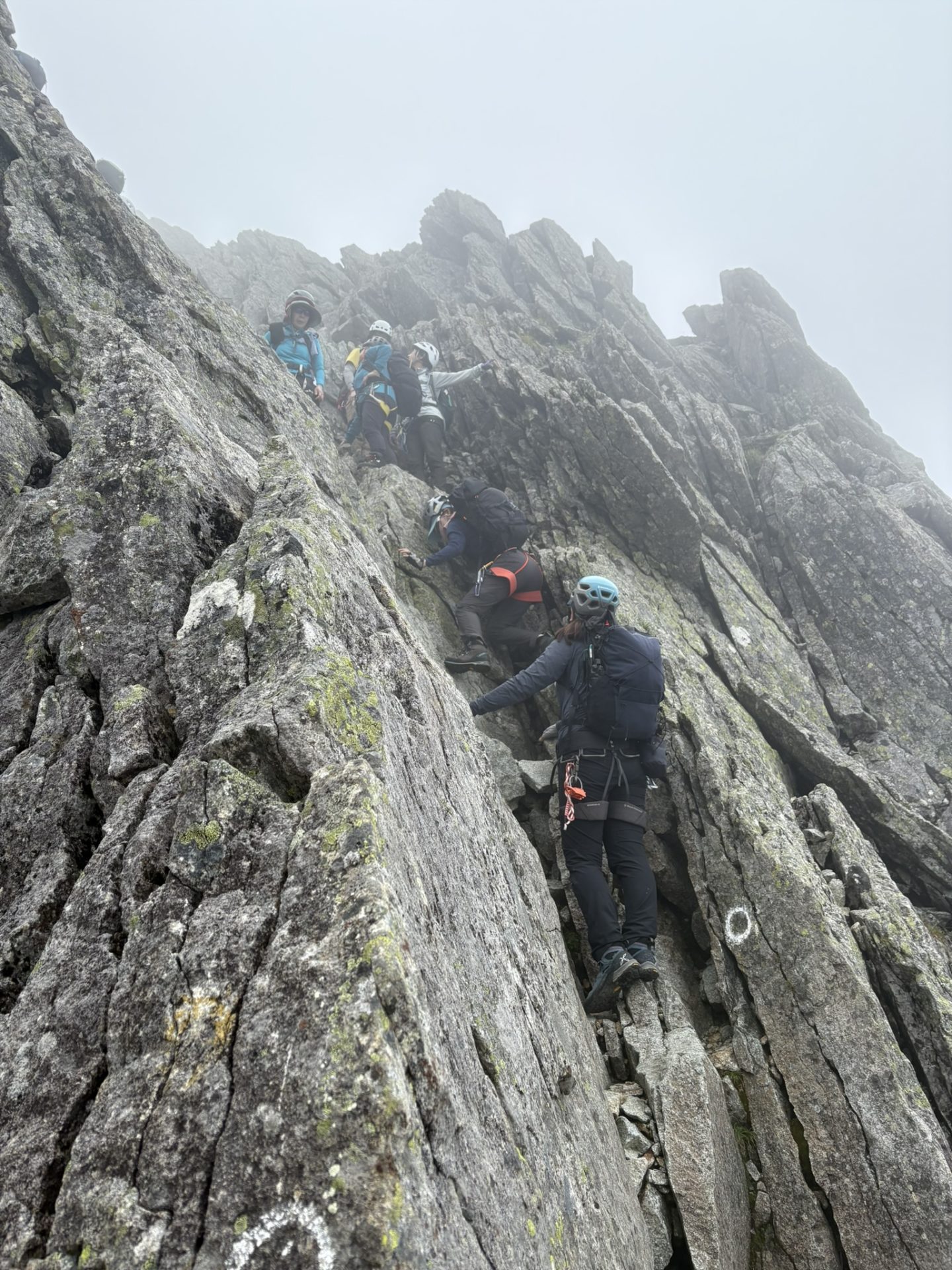 霧が流れ込み、視界は数歩先まで縮まった。なぜか岩肌に書かれた「ウマノセ」の白い文字が浮き立ち、我々を手招きしている。左右の奈落は見えないが、その存在感は肌を刺すように伝わってくる。雨具のフードを打つ雨音、カラビナの金属音、自分の呼吸――静寂の中で、すべてが緊張を刻むリズムになった。