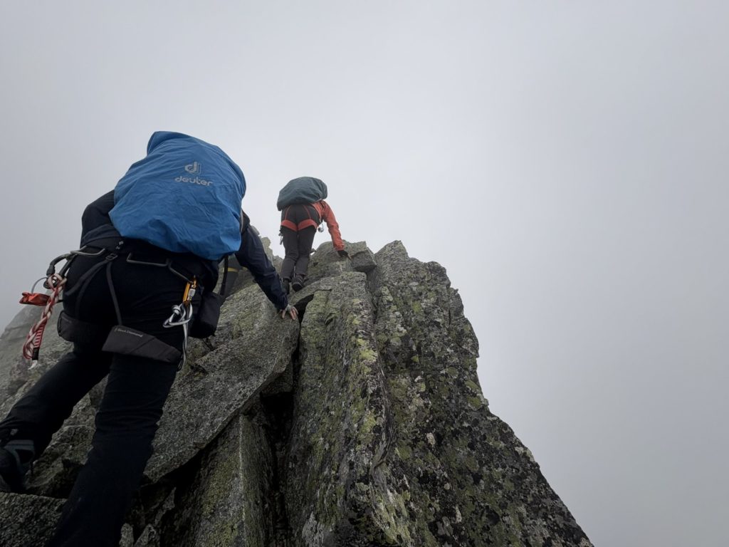 パーティー仲間全員が無事に踏破したものたちだけが歩くことができる「ビクトリーロード」。ふつふつと胸の中に達成感が広がる。振り返ると雲に巻かれたジャンダルムがあった。雲に阻まれ全貌は見えないけれど、これまでの道のりが一本の糸のように眼下に伸びているはずだ。その糸は決して真っ直ぐではなく、風に揺れ、時に裂けそうになっていることだろう。だけど確かに続き、私たちはそこを歩き切ったのだ。人生の道もまた、きれいな一直線ではない。谷底を覗き込む瞬間もあれば、雲に包まれて方向を失うときもある。だが一歩一歩を積み重ね、仲間と支え合えば、振り返った時それはかけがえのない「自分だけの稜線」になる。